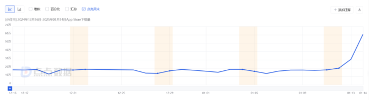 在下载量方面,此前小红书在全球市场苹果端日下载量普遍20万以下,自1月12日起开始飙升,至1月14日美国市场苹果端单日预估下载量达60.8万,较增长前的1月11日提高了42.9万,增幅高达238.8%。