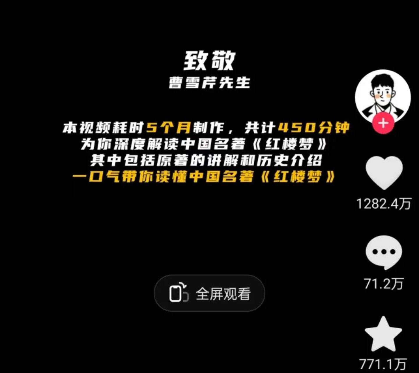 从年中开始,超长视频在抖音突然爆火。博主@米三汉的一支450分钟解析《红楼梦》的视频,收获了近1300万点赞,总播放时长达到5.6亿分钟,是抖音近半年内播放量和收藏量排名第一的作品。