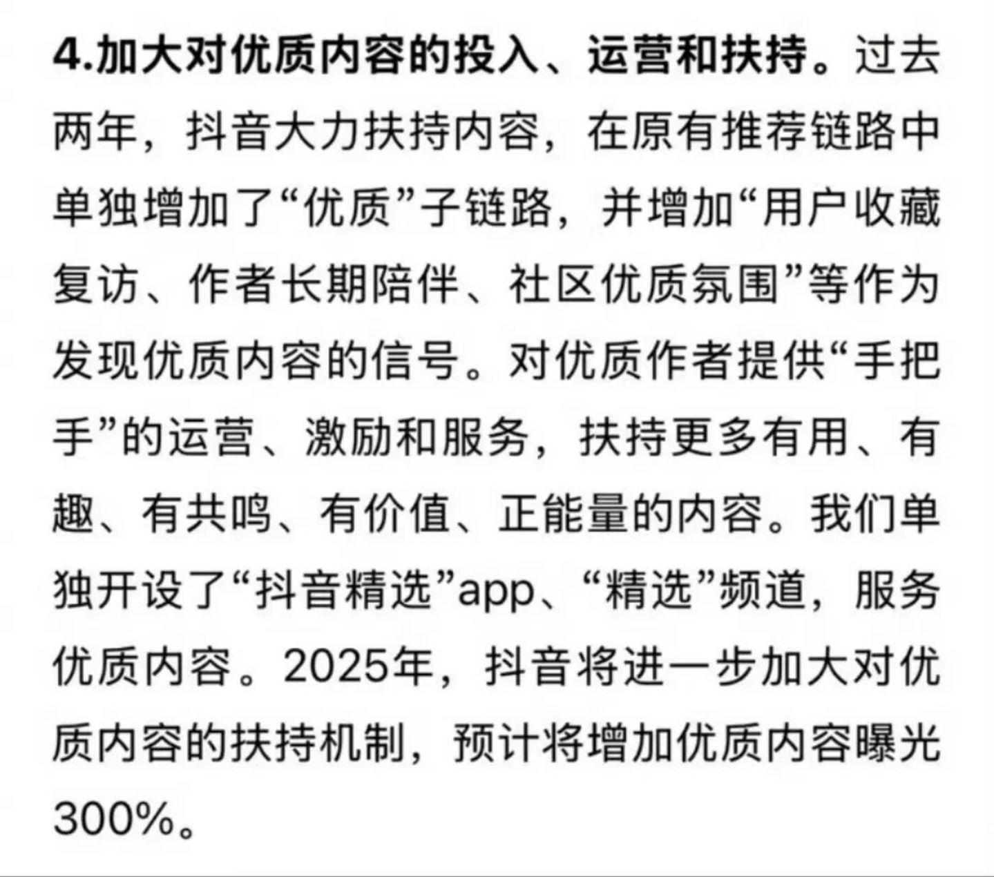 作为独立App的成绩虽然远远无法与红果相提并论,但其重要性在于给用户提供更多样化的内容选择。其浏览逻辑,是对过去个性推荐单页瀑布流的挑战,但好处在于,巧妙回应了外界对于算法与信息茧房的质疑。2025年1月3日,抖音宣布将推出10项措施推动算法和平台治理透明化,其中一条便是“在原有推荐链路中单独增加了‘优质’子链路……单独开设了‘抖音精选’app、‘精选’频道,服务优质内容”。