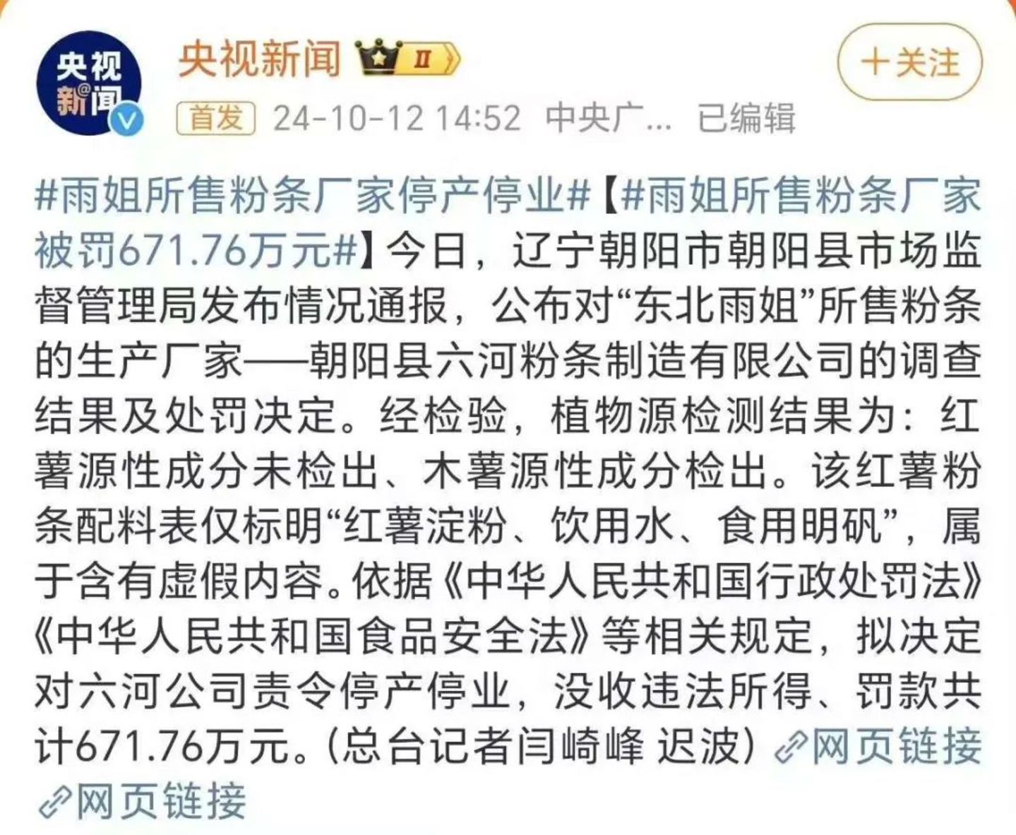 紧随其后的东北雨姐也是十分近似的情况。早前的“稻田蟹”事件引发质疑但并未致命,9月23日却遭到打假博主质疑所售红薯粉其实是木薯粉,10月12日被通报存在“虚假或者引人误解的商业宣传”,被处没收违法所得和罚款共计165万元,并责令暂停经营限期整改。