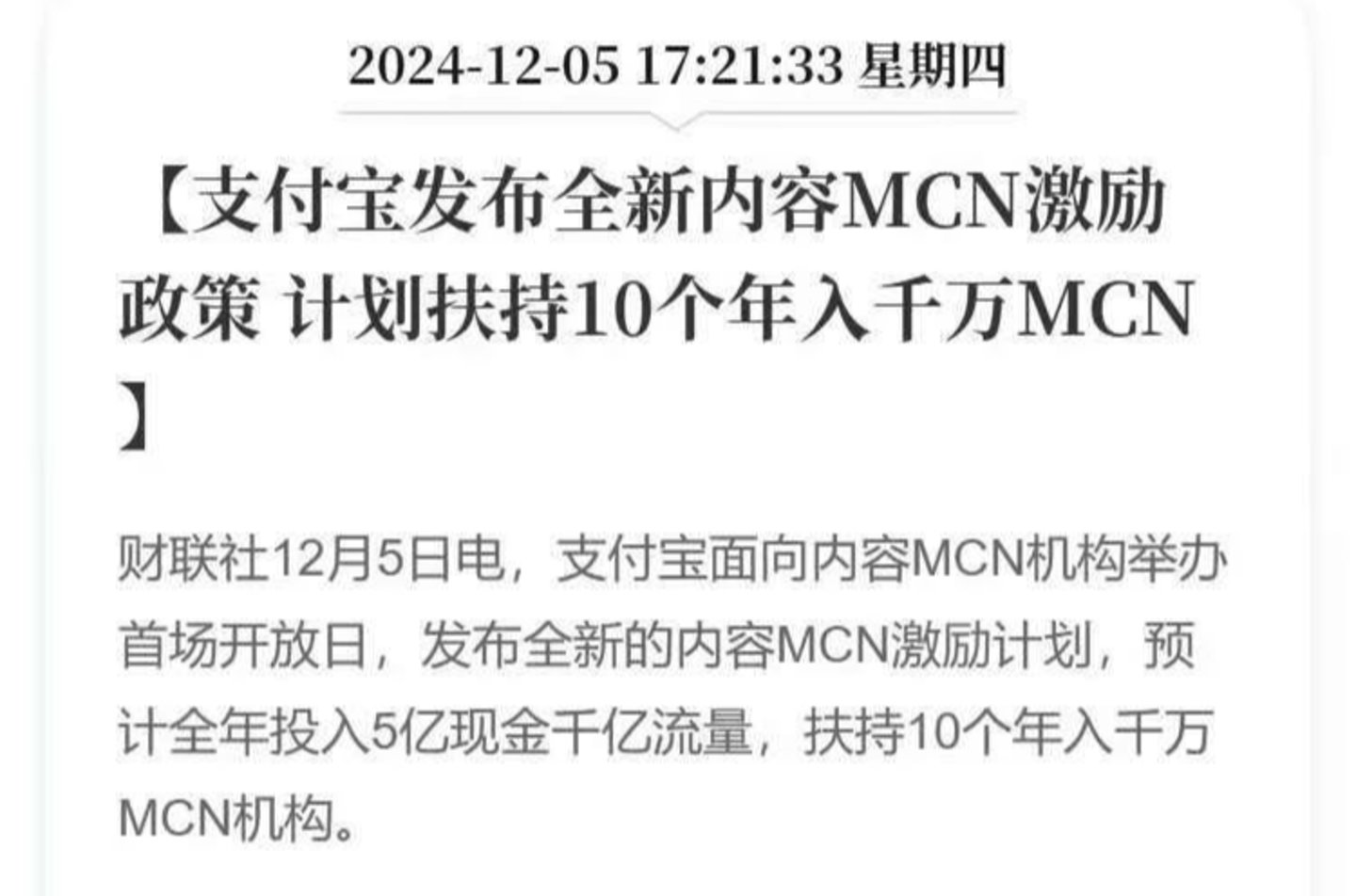 京东发布了针对内容生态的多个扶持计划,拿出10亿流量和10亿现金持续招募优质内容创作者。美团推出了“春鸣计划”,按照不同的创作者等级进行奖励划分,还针对优质公会和机构设立了“机构特别奖金”的额外奖励。支付宝也发布了全新的内容MCN激励计划,预计投入5亿现金和千亿流量以吸引MCN机构入驻。