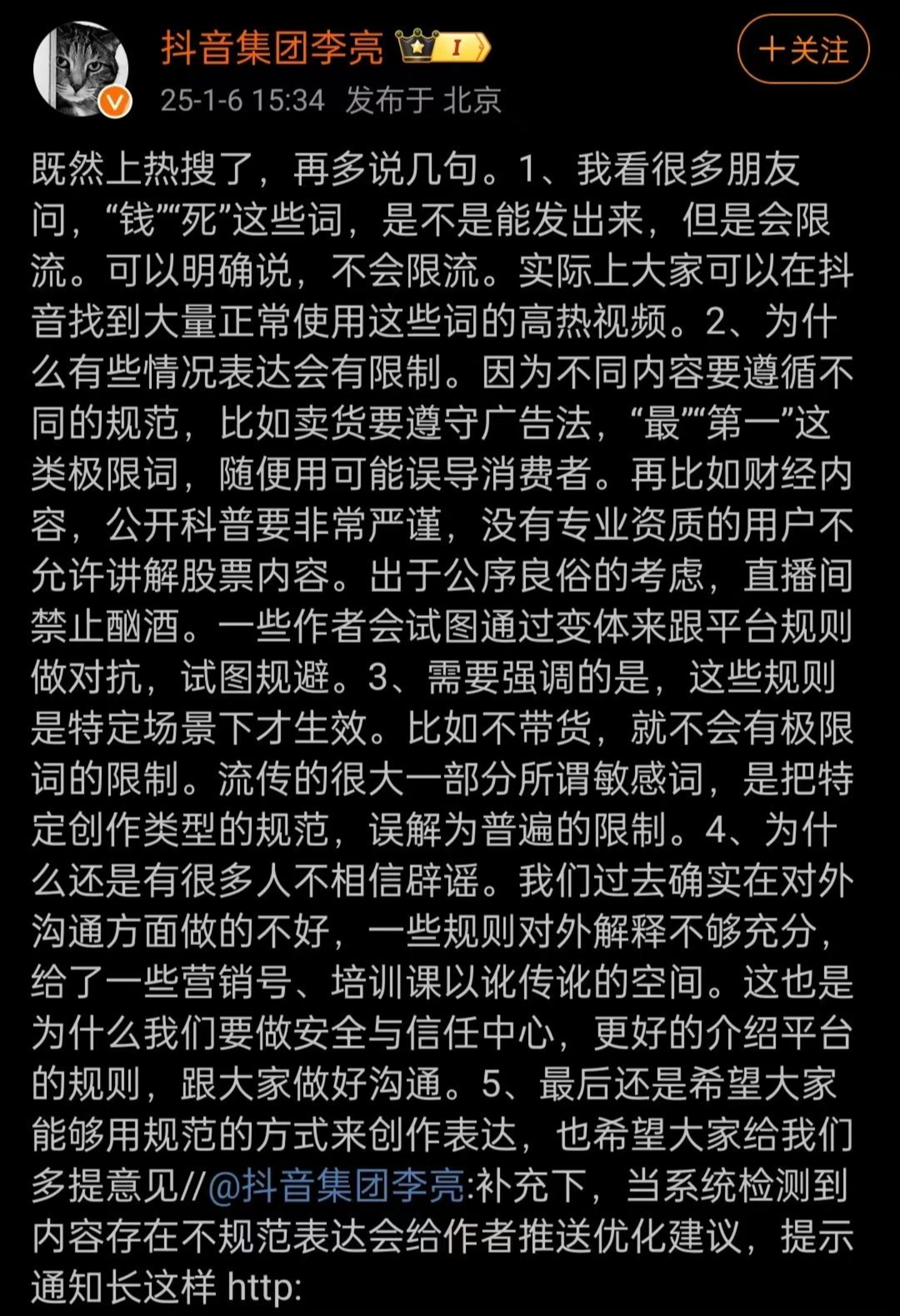 2024年底,抖音终于开始对外逐步推进算法科普工作。抖音集团副总裁李亮在1月6日的进一步声明中明确表示:“在抖音平台上,诸如‘钱’、‘死’等词汇的使用并不会受到限流处理。”李亮进一步补充道,实际上,很多正常使用这些词汇且热度高的视频内容,均在抖音平台上存在。