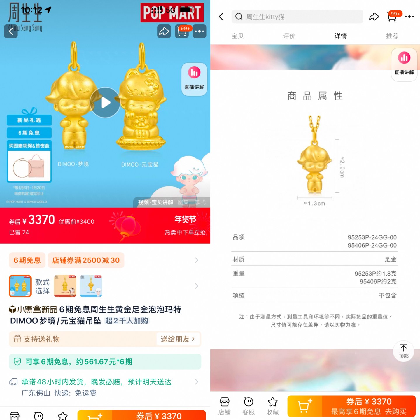 据猎云网在天猫上搜索发现,周生生黄金足金泡泡玛特DIMOO梦境/元宝猫吊坠单颗售价3400元,足金约1.8克/2克,单算下来也达到了1700元/克,是1月15日周生生812元/克金价的超2倍。