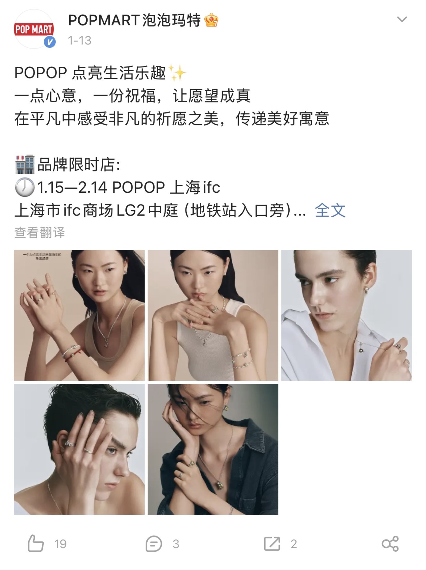 不仅官宣推出“一个为点亮生活乐趣而生”的全新珠宝品牌“POPOP”,还同期宣布了1月15日起两场位于上海和深圳的品牌快闪活动。