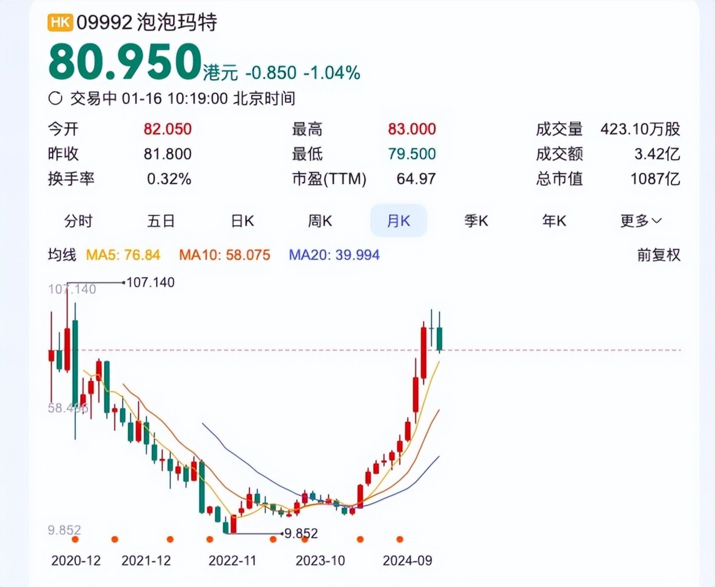 但在过去一年,泡泡玛特在业绩水涨船高之后,股价跟市值也一骑绝尘。