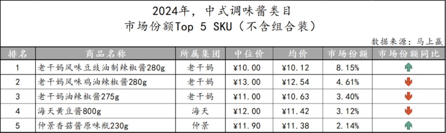 基于SKU销售额在类目销售额中的份额来看类目中的Top SKU,中式调味酱市场中的TOP 5 SKU市场份额合计超过20%。其中,老干妈旗下三款产品便占据了16%左右的份额,另外两款产品则归属于海天、仲景旗下。此外,三个企业的产品口味也体现出其不同的定位与目标人群,老干妈凭借特色的辣椒酱在市场中打下一片江山,海天依赖黄豆酱,仲景则是香菇酱。
