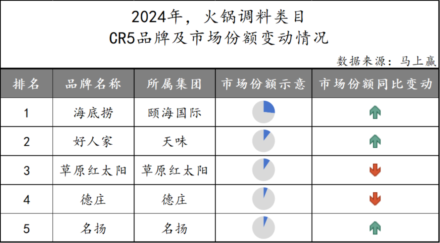 颐海国际集团的市场份额在份额同比正增长的加持下,其类目第一的位置较为稳固。好人家、草原红太阳、德庄以及名扬四大企业之间的市场份额差距相对更小一些,其中天味与名扬同比增速均为正,市场份额保持增长。