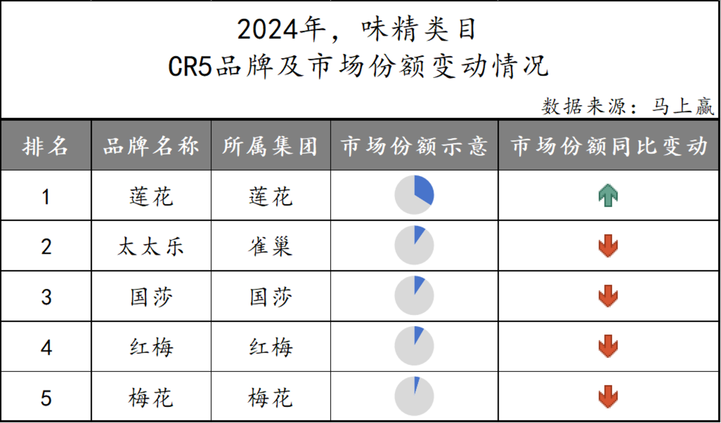 在同比增长势头最为迅猛的味精类目中,莲花市场份额占比超过四分之一,且同比仍然呈现正增长态势。余下的太太乐、国莎、红梅以及梅花四大企业所占份额均在10%以内。