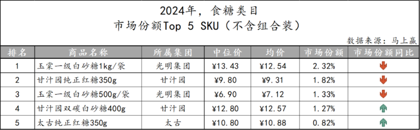 基于SKU销售额在类目销售额中的份额来看类目中的Top SKU,有两款为光明集团产品,两款为甘汁园集团产品,余下的一款属于太古。其中,从口味上看,红糖、白糖各有侧重,两糖种占据了Top5 SKU。