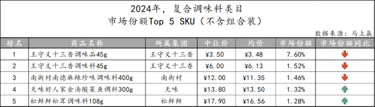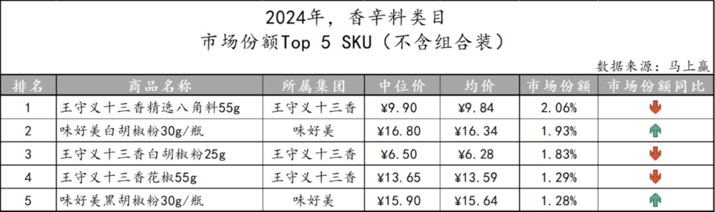 基于SKU销售额在类目销售额中的份额来看类目中的Top SKU,尽管香辛料类目的品牌集中度并不算高,但TOP5 SKU仍均为CR5企业旗下。其中,共有三款产品为王守义十三香所有,另外两款则归属味好美阵营。另外,该类目下TOP5 SKU中最高也仅有2.06%的市场份额,可见其市场份额整体较为分散。