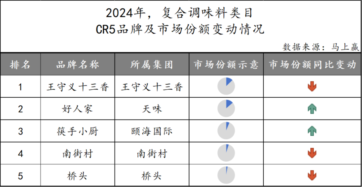 相较于前文其他类目,复合调味料类目下CR5品牌所占市场份额之和明显更低,侧面体现出其品牌集中度相对较低。结合头部品牌份额的同比变化来看,王守义十三香与天味两大企业间差距较小但同比走势相反。CR5品牌中的筷手小厨、南街村以及桥头三家份额更小,且仅有颐海国际同比正向增长。
