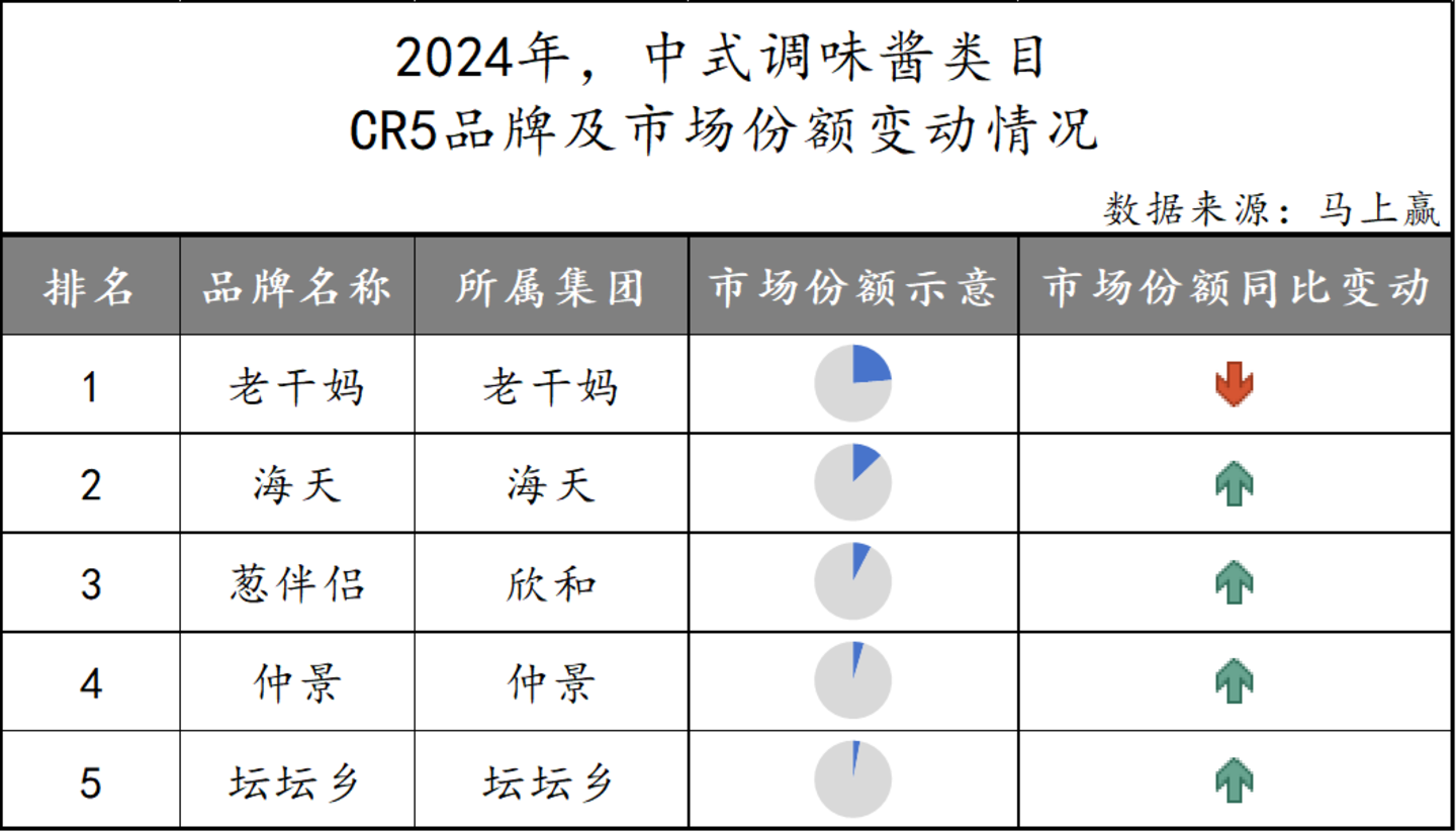 相较于酱油,中式调味酱类目下品牌集中度更低一些,市场份额最高的老干妈约占据类目整体四分之一的市场份额。尽管同比来看份额有所下跌,但老干妈仍然领先于后几名较多。此外,海天、欣和、仲景与坛坛乡也均有品牌进入CR5品牌之列,市场份额虽相对较小但同比均有所增长,显示出一定的市场竞争力和发展潜力。