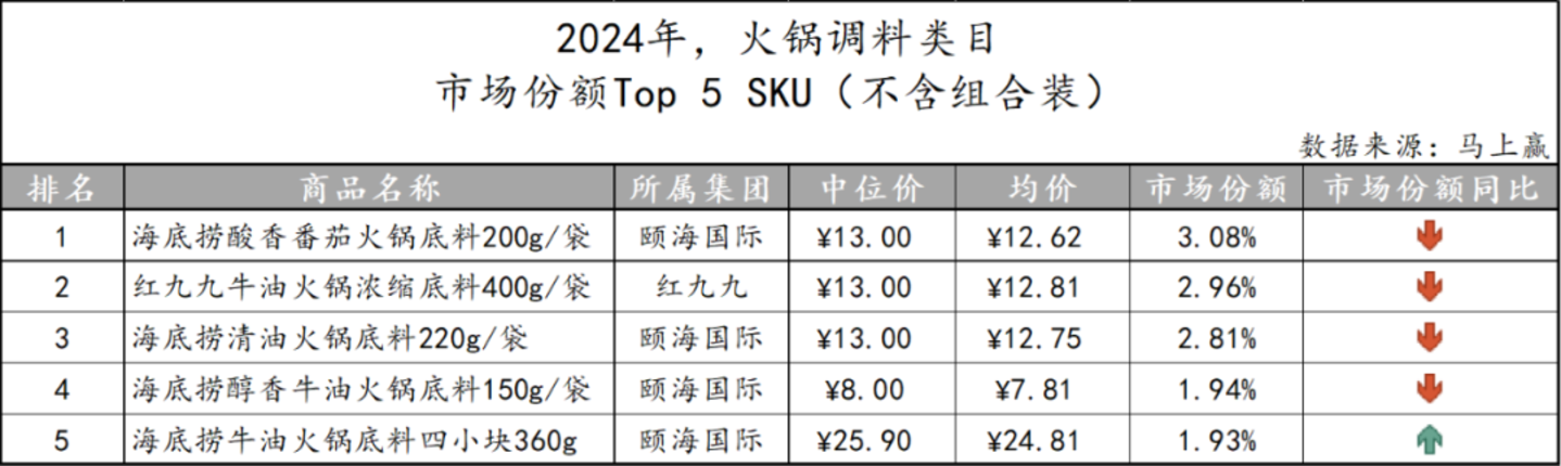 基于SKU销售额在类目销售额中的份额来看类目中的Top SKU,从火锅调料类目TOP5 SKU的企业归属来看,颐海国际出现频率较高。该企业旗下的四款TOP SKU口味各不相同,这也体现出行业龙头在产品创新与培养上的实力所在。此外,红九九虽并非头部企业中的一员,但其牛油火锅浓缩底料却凭借2.96%的市场份额排在第二位,这或许说明中小企业仍有可能通过在单一口味上的深耕培育出大爆品,从而为自身的长远发展打下基础。