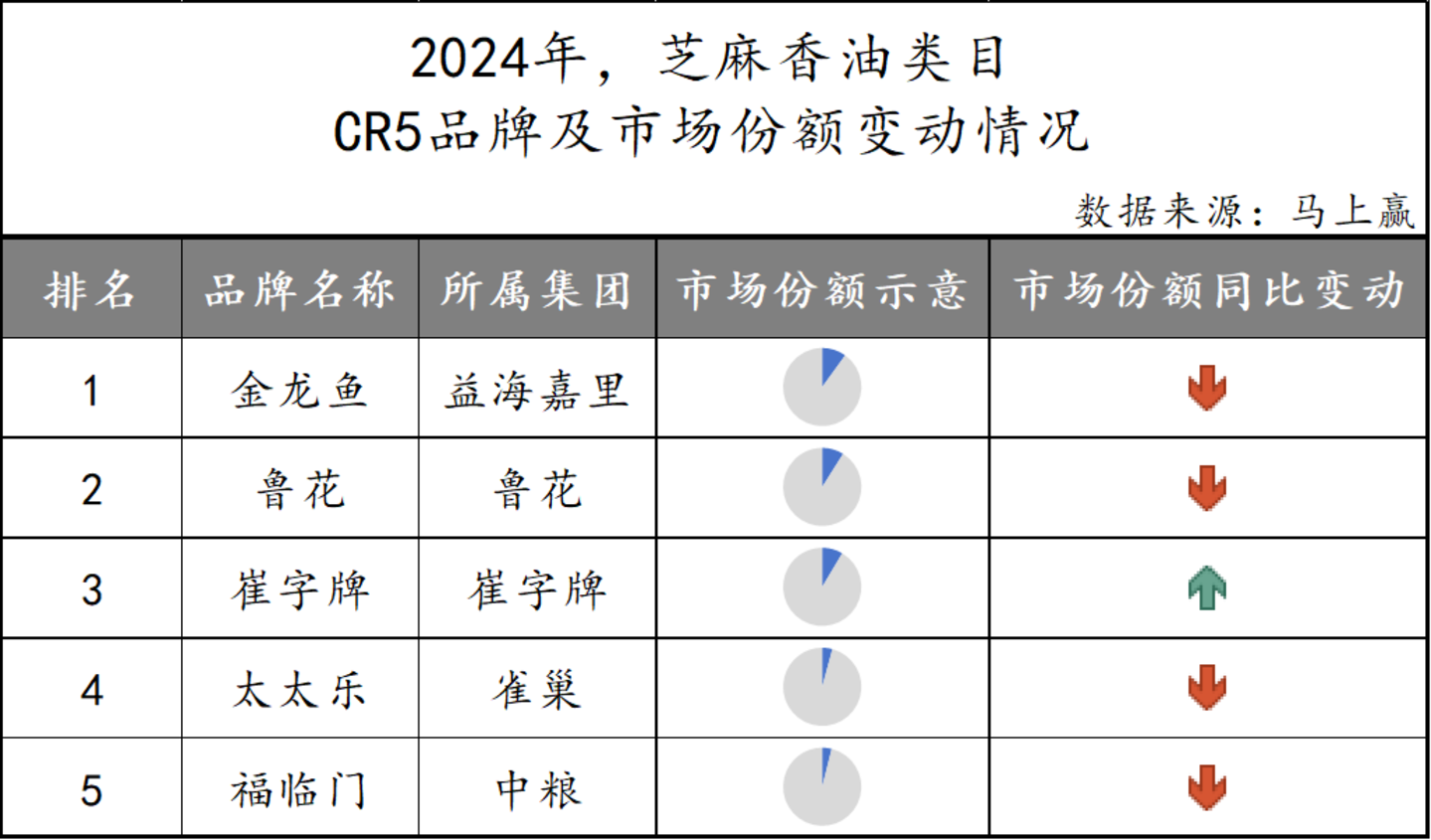 芝麻香油市场格局基本为金龙鱼、鲁花与崔字牌三足鼎立,但三个品牌的市场份额差异并不大。而雀巢太太乐、中粮福临门虽同为CR5品牌,但所占份额较低,市场影响力较为有限。而结合市场份额的同比变动情况观察,可以看到仅有崔字牌一家发展呈现市场份额同比增长。