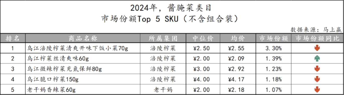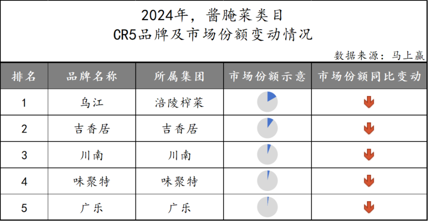 在酱腌菜市场中,乌江榨菜凭借其在类目的多年深耕市场份额稳居第一位,吉香居、川南两大企业分别名列第二、第三,紧随其后的是份额更小的味聚特和广乐。结合同比数据观察,在类目整体份额同比微涨的情况下,CR5企业的市场份额却纷纷有所下跌,或许说明酱腌菜市场中有更多新品牌正在向头部企业发起冲击。
