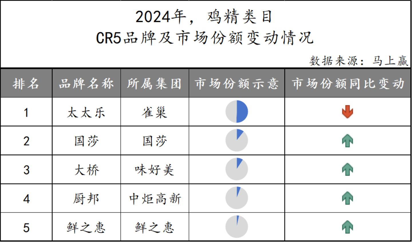 太太乐在鸡精市场中可谓是一家独大,所占市场份额在50%左右。国莎、大桥、厨邦以及鲜之惠与之同为CR5品牌之列,份额明显更低的同时,均有一定程度的同比增长。