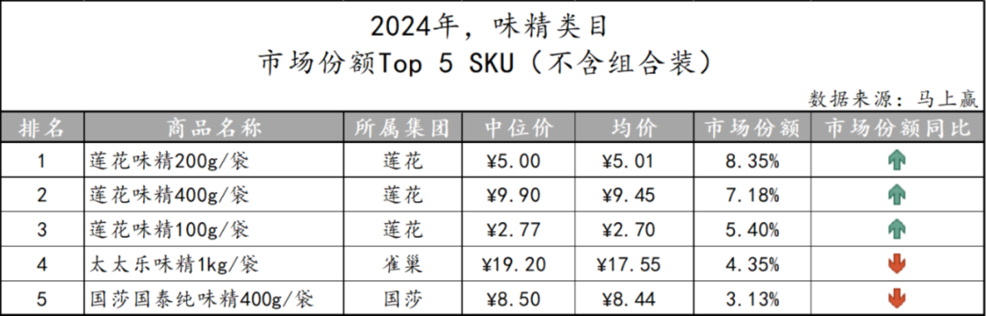 基于SKU销售额在类目销售额中的份额来看类目中的Top SKU,在类目的TOP5 SKU中,莲花味精200克、400克与100克分别为第一至三位,所占市场份额也均在5%以上,由此可见莲花在味精类目中的影响力之大。此外,雀巢太太乐和国莎各占有一席,但SKU的份额同比走势与企业相同,均不容乐观。