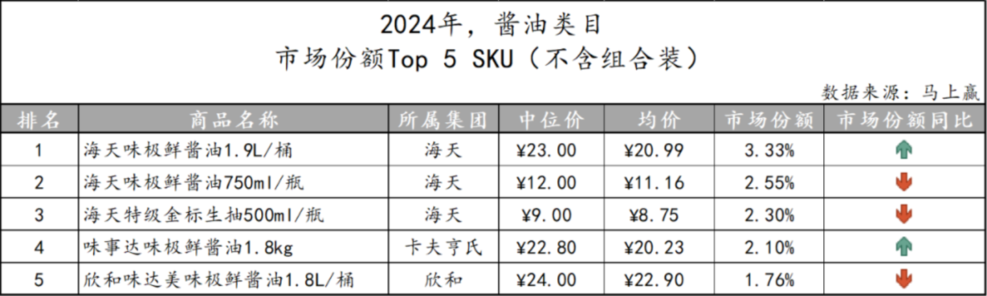 基于SKU销售额在类目销售额中的份额来看类目中的Top SKU,海天在酱油市场中的影响力在其占据前三的TOP5 SKU中也可见一斑,且其旗下三款产品在规格上也各有不同,侧面体现其产品矩阵较为丰富。余下两款产品分别来自于卡夫亨氏集团和欣和集团,TOP5 SKU中共有60%为规格超过1L的产品。