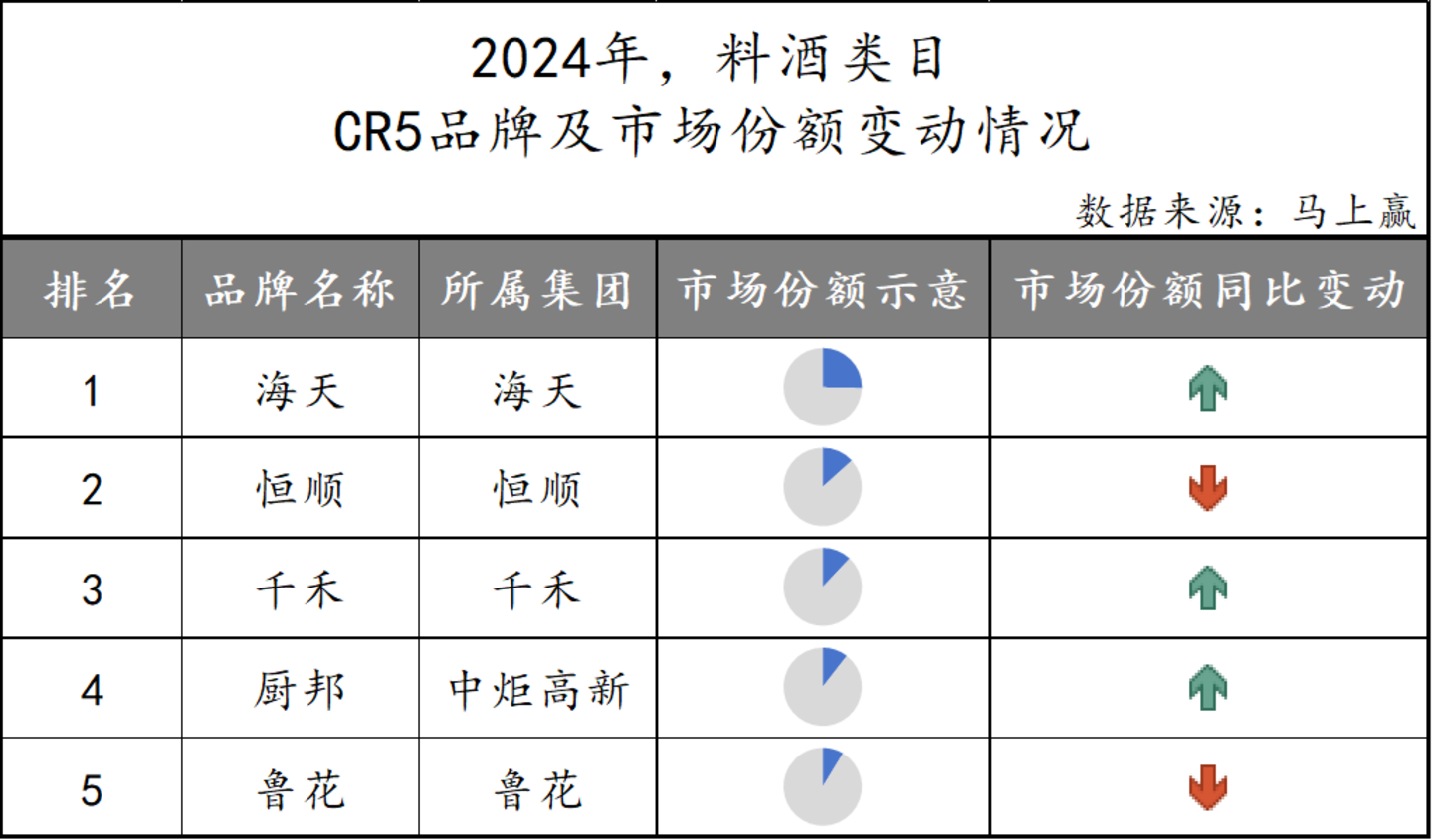 料酒类目下,大多数市场份额集中于海天、恒顺等头部企业中,尤其是海天占据了25%左右的市场份额,稳居第一位。此外,CR5品牌中恒顺、鲁花市场份额呈现同比负增长,其余企业均走势向好。