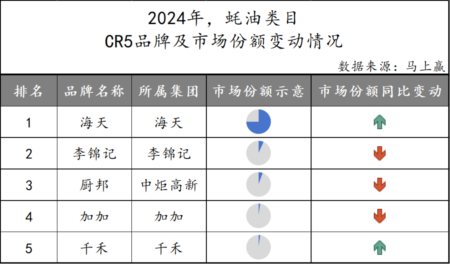 蚝油类目下的CR5品牌与酱油类目重合度较高。在蚝油市场中,海天所占份额约四分之三左右,且同比来看仍在增长。李锦记、厨邦、加加与千禾虽然同样也位列CR5企业,但市场份额比较有限。