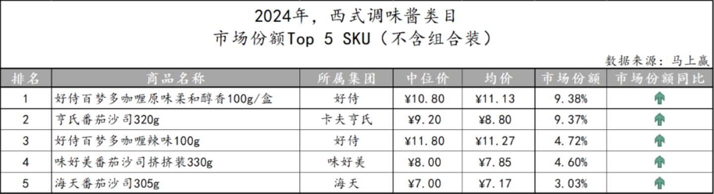 基于SKU销售额在类目销售额中的份额来看类目中的Top SKU,在西式调味酱类目市场份额TOP5 SKU中,好侍旗下两款均为咖喱类产品,而卡夫亨氏、味好美及海天旗下市场份额位列前五的则是番茄沙司类产品,可见不同企业在该类目内的产品构成有所不同。另一个值得注意的是,五款产品均呈现市场份额同比增长。