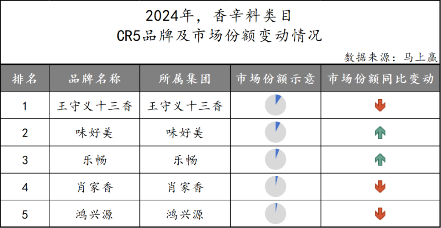 在香辛料市场中,市场份额排在前五位的品牌分别为王守义十三香、味好美、乐畅、肖家香以及鸿兴源,五大企业所占市场份额总计相对较小。同比来看,仅有排在第二、三位的味好美和乐畅份额有所提升。在此情况下,市场份额略高一些的王守义十三香市场地位也并不算稳固,CR5的排序仍在未来有较大的变动可能。