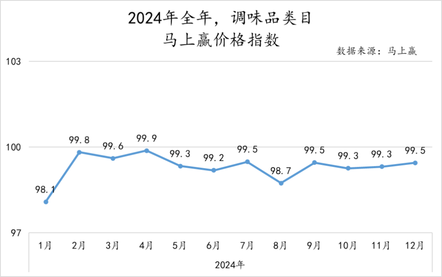 基于马上赢价格指数(WPI),对2024年调味品类目整体的价格走势进行分析。可以看到,与去年同期相比,类目整体的价格指数稳定在98以上,变动幅度也不大,类目整体价格走势较为稳定,仅有一月、八月两个较为短暂的低谷。