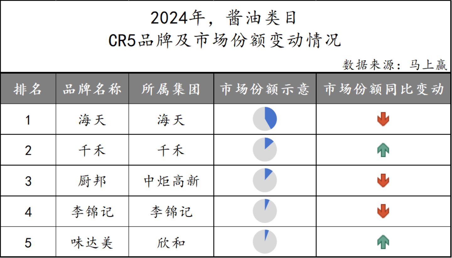 酱油市场中,CR5品牌由海天、千禾、厨邦、李锦记以及味达美构成。其中海天占据超三分之一类目份额。