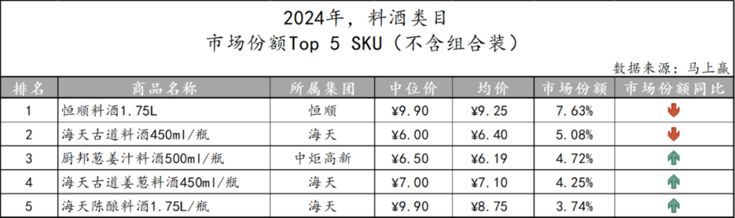 基于SKU销售额在类目销售额中的份额来看类目中的Top SKU,与该类目的品牌集中度相对应,其TOP5 SKU所占市场份额也达到了25%左右,显示出头部企业在料酒市场中的影响力所在。另外可以关注到,海天的古道、陈酿系列料酒,与其他上榜产品形成了一定的产品差异化,未来发展需要进一步关注。