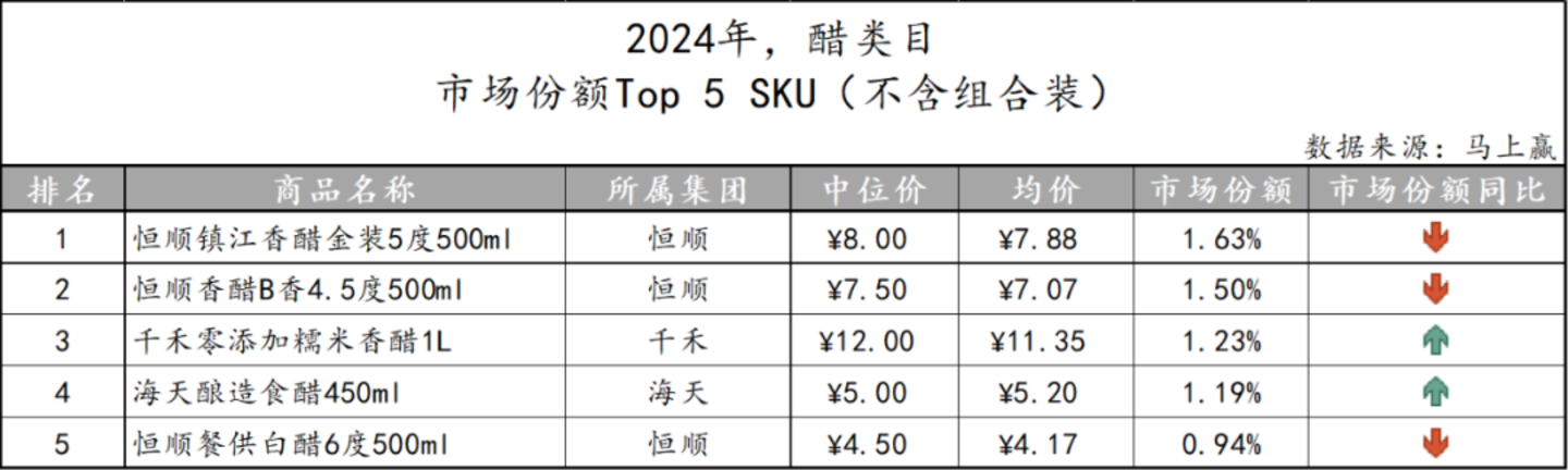 基于SKU销售额在类目销售额中的份额来看类目中的Top SKU,食醋市场中较高的品牌集中度在TOP5 SKU的企业归属上也有所体现,其中恒顺作为该市场中的企业更是独揽三款TOP SKU。此外,海天与千禾虽各自仅有一款产品市场份额位列前五,但其产品份额同比来看均有所增长。