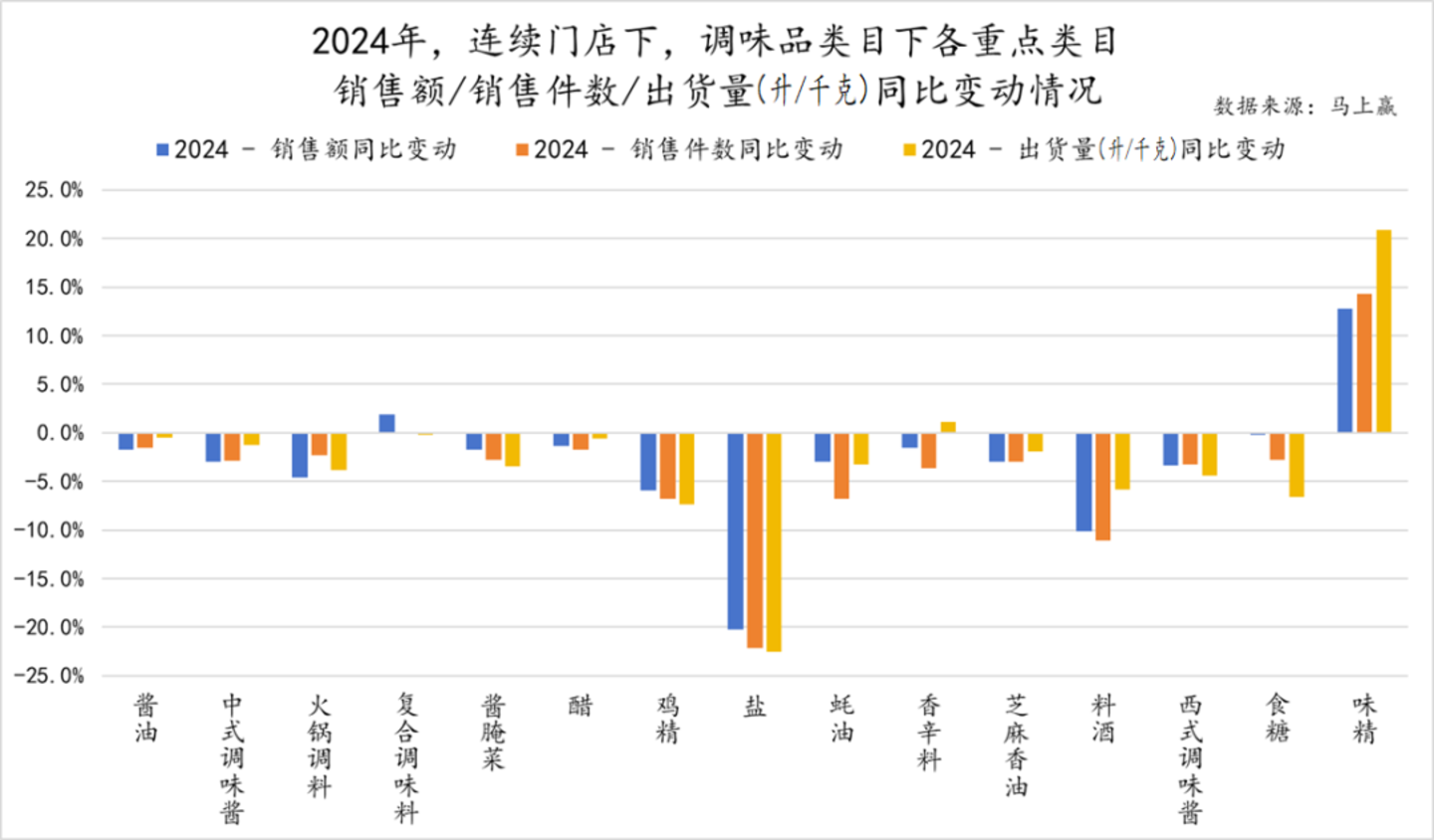 2025年春节即将到来,调味品市场内2024年的群雄逐鹿戏码也落下帷幕。值此新春即将来临之际,中国调味品协会大数据信息中心携手线下零售监测网络马上赢,以2024年年度视角,对调味品类目整体以及其中重点类目的发展情况进行盘点,以此观察类目市场发展态势。
