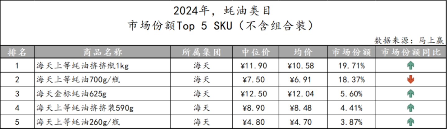基于SKU销售额在类目销售额中的份额来看类目中的Top SKU,海天蚝油类目中TOP5 SKU均为海天旗下产品,其中上等蚝油以及上等蚝油挤挤瓶两款不同包装方式的产品市场份额之和就已经接近40%。
