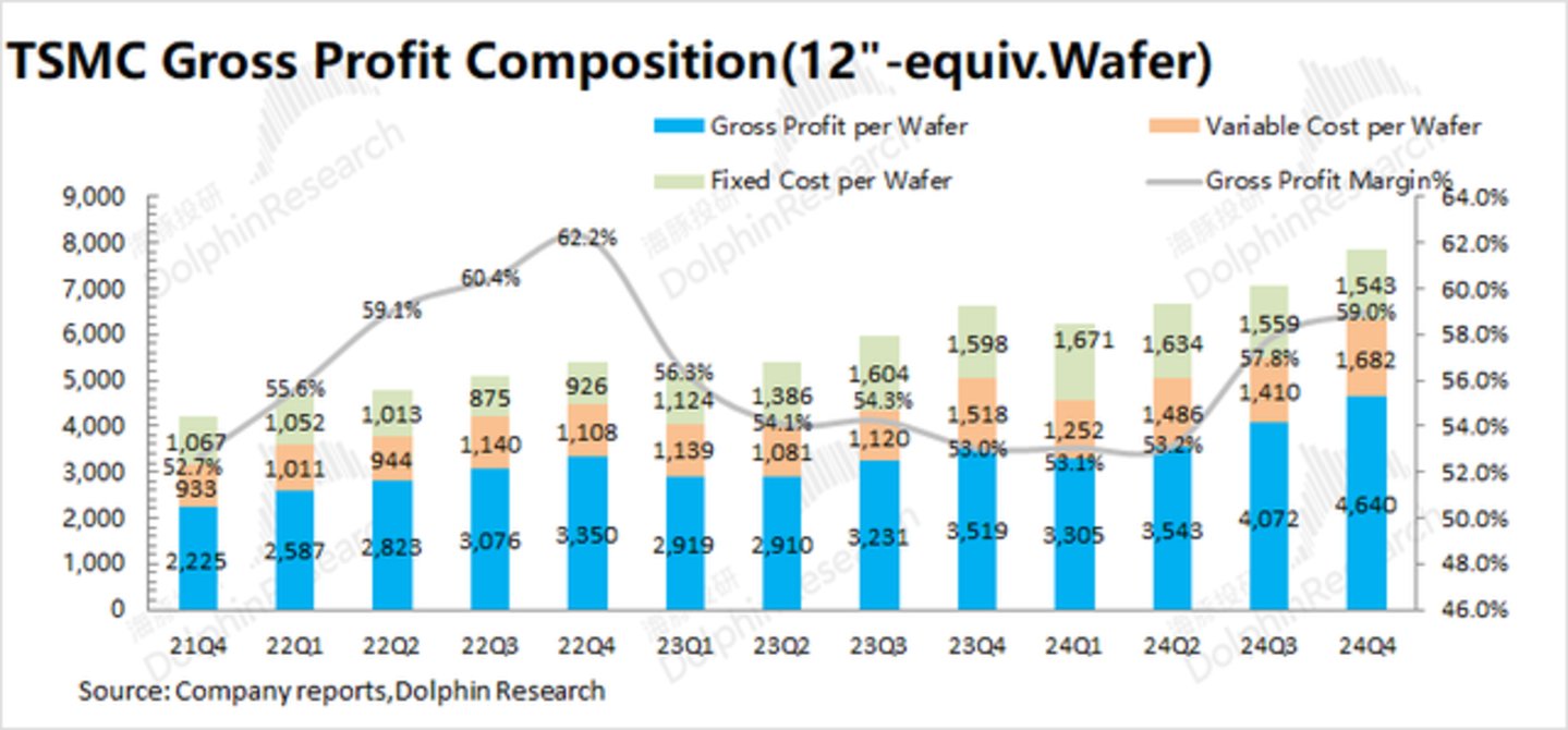 3)可变成本(其他制造费用):2024Q4台积电平均可变成本约1682美元/片,环比增加272美元/片。随着3nm及5nm产品占比提升,单位可变成本呈现趋势性提升的情况;