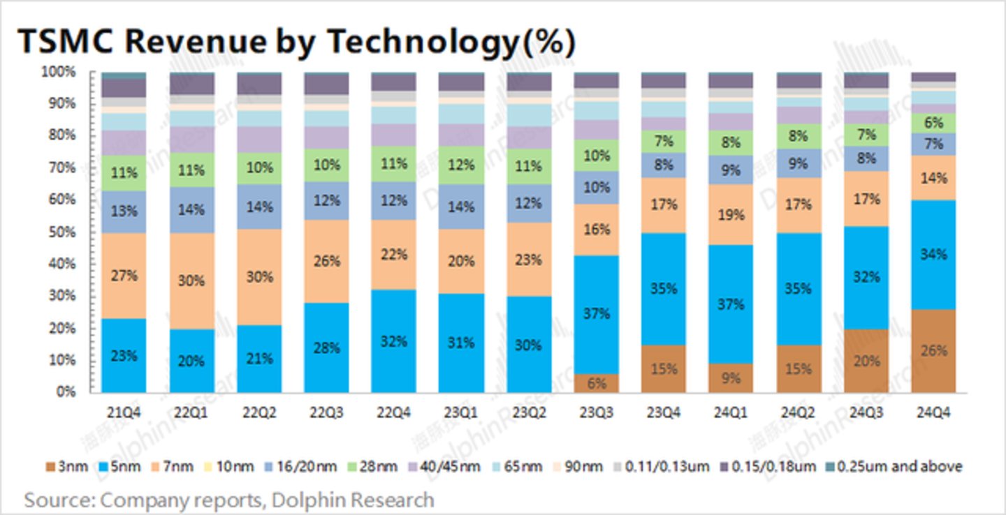 在苹果新机iPhone16全系列搭载3nm芯片的情况下,公司本季度3nm占比进一步提升。另外在算力芯片等需求的带动下,公司5nm及以下占比创新高,合计达到6成。