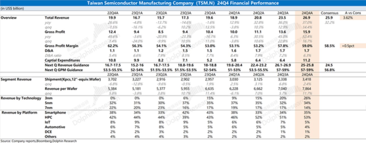 台积电(TSMC)于北京时间2025年1月16日下午的美股盘前发布了2024年第四季度财报(截止2024年12月),要点如下:
