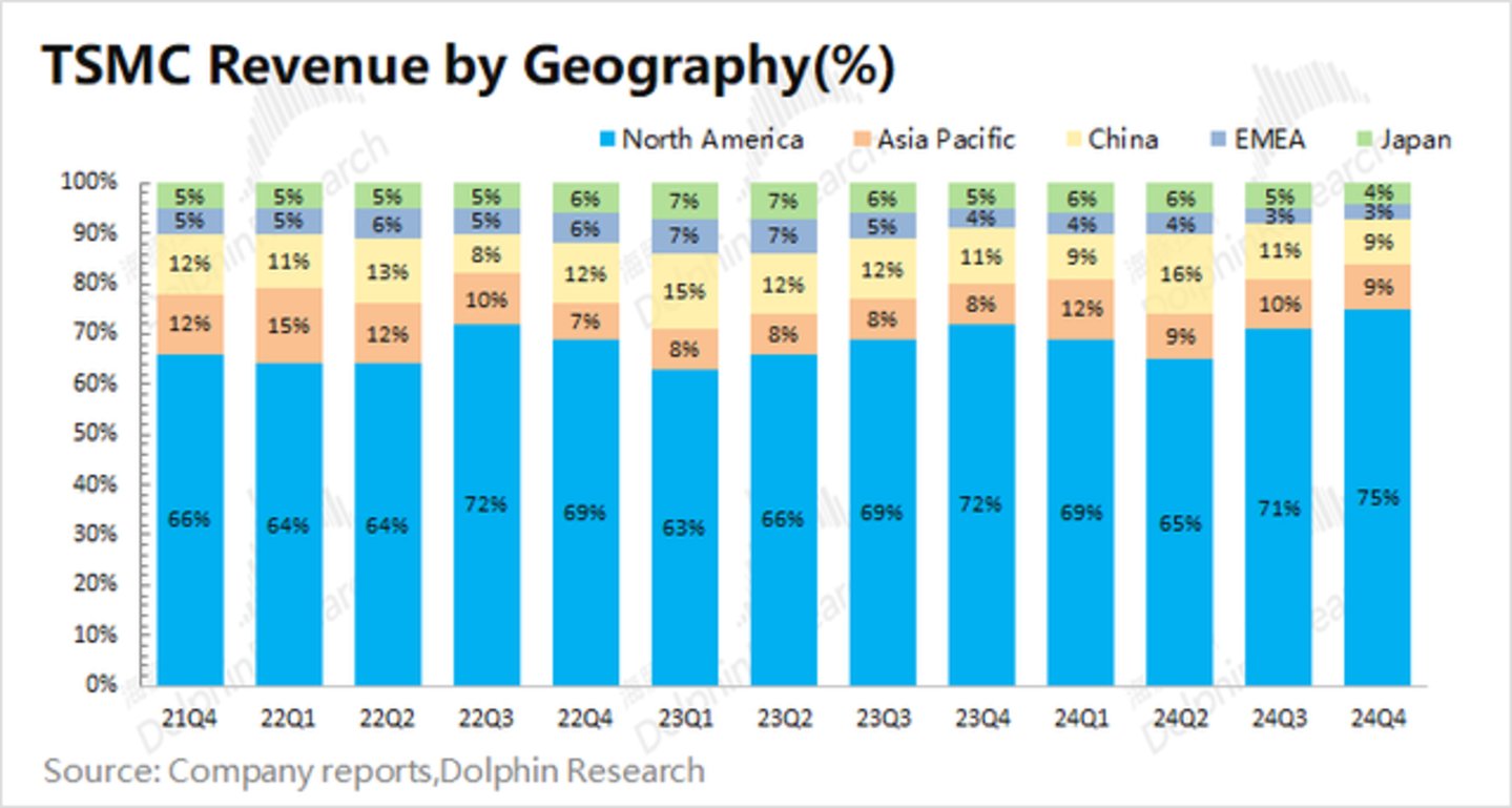 3、晶圆结构端:5nm及以下占比达六成。智能手机和高性能计算,是公司本季度收入增长的主要来源。其中本次苹果新机iPhone16全系列搭载3nm芯片,直接带动本季度3nm收入占比提升至26%。叠加英伟达Blackwell等算力芯片的需求,当前公司7nm及以下的收入占比已经提升至74%。在苹果和英伟达等美国客户的带动下,公司本季度北美地区收入占比进一步提升至75%。