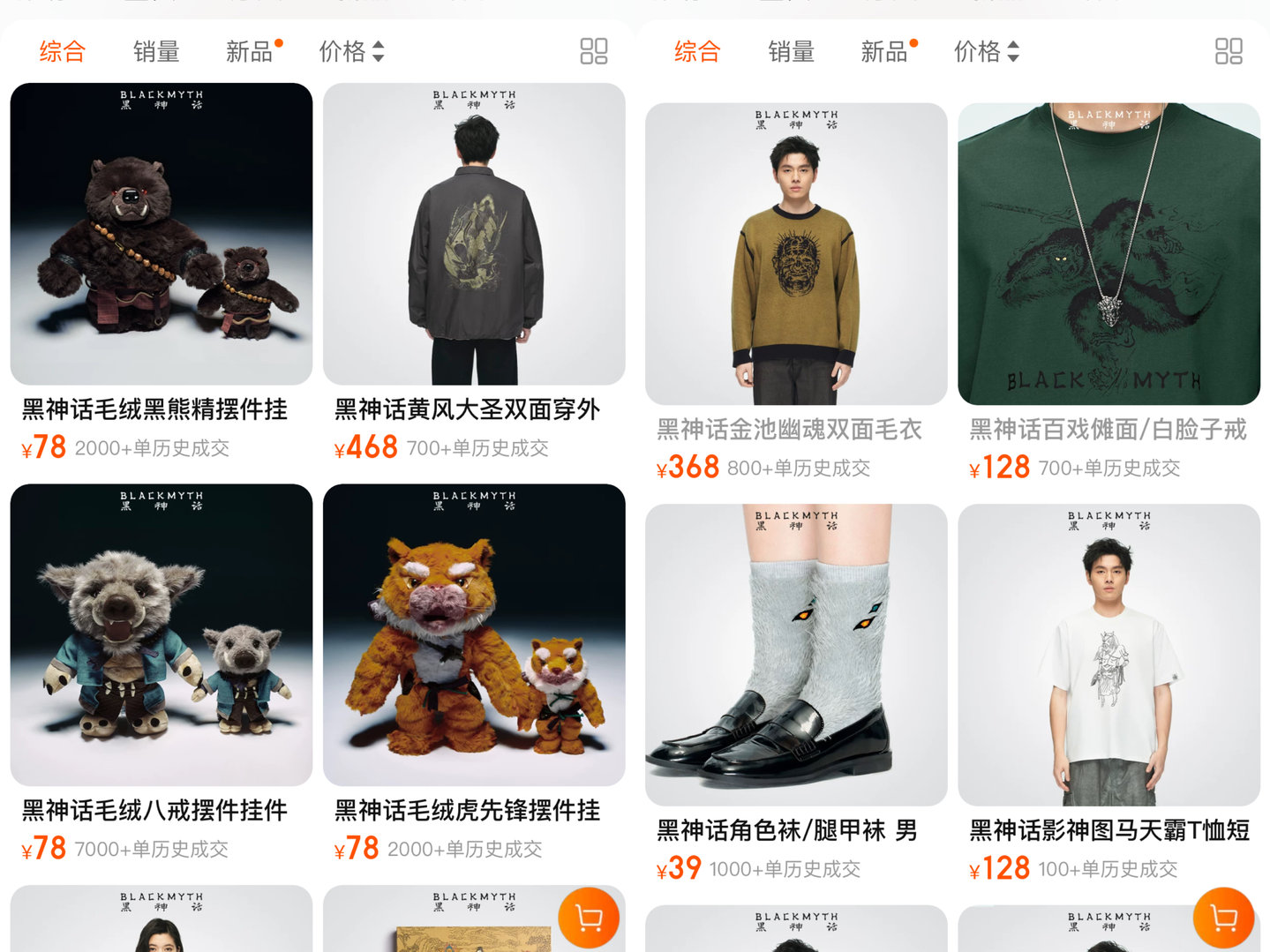 首弹产品主要围绕《黑神话:悟空》游戏周边开发,并于名创优品部分门店,天猫、京东首发。SKU不算多,包括徽章、袜子、环保袋、毛绒玩偶和挂件、卫衣、T恤、地毯织毯。