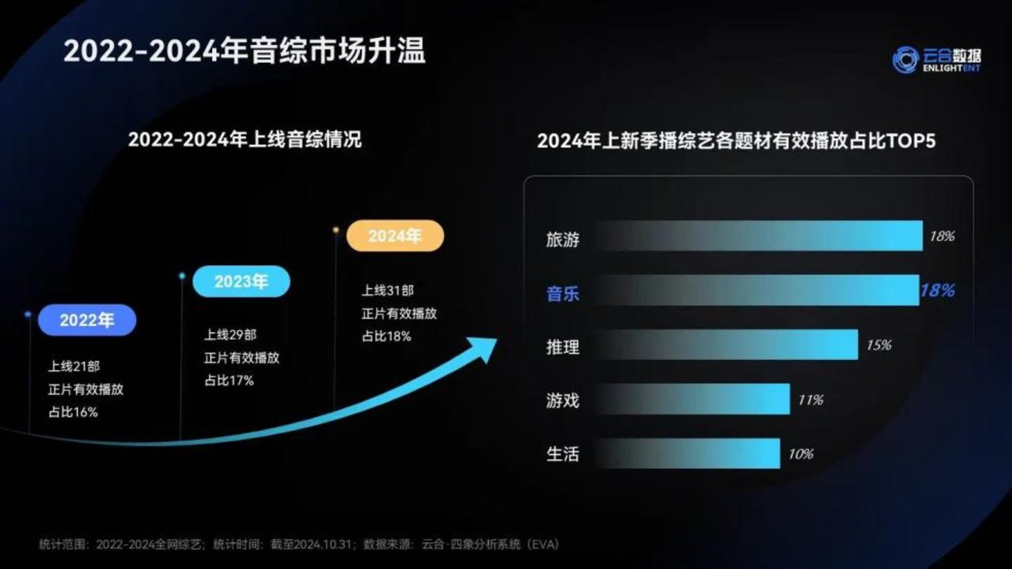 今年音综回暖势头明显。云合数据显示:2022-2024年,音综的上线部数及正片有效播放占比逐年增长,截至2024年10月31日,各平台共计上线音综31部,包括19部新综(有效播放占比为24%)和12部综N代(其有效播放占比达76%),已超2023年全年总量。而在2024年上新季播综艺各题材有效播放占比中,音乐节目达18%,与旅游节目持平,并列成为2024年市占率最高的综艺类型。其中,《乘风2024》《披荆斩棘第四季》《新说唱2024》《歌手2024》《天赐的声音第五季》5部节目的有效播放占比高达71%。