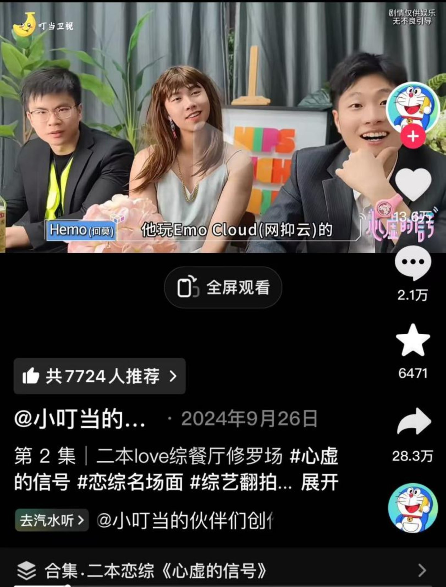 没有瓜吃、没有名场面审判,观众们还能自发二创。今年的恋爱综艺也没有爆冷,《心动的信号7》开局即以“二本恋综”杀入话题中心,网友自发录制二本恋综内容被迅速传播点赞。