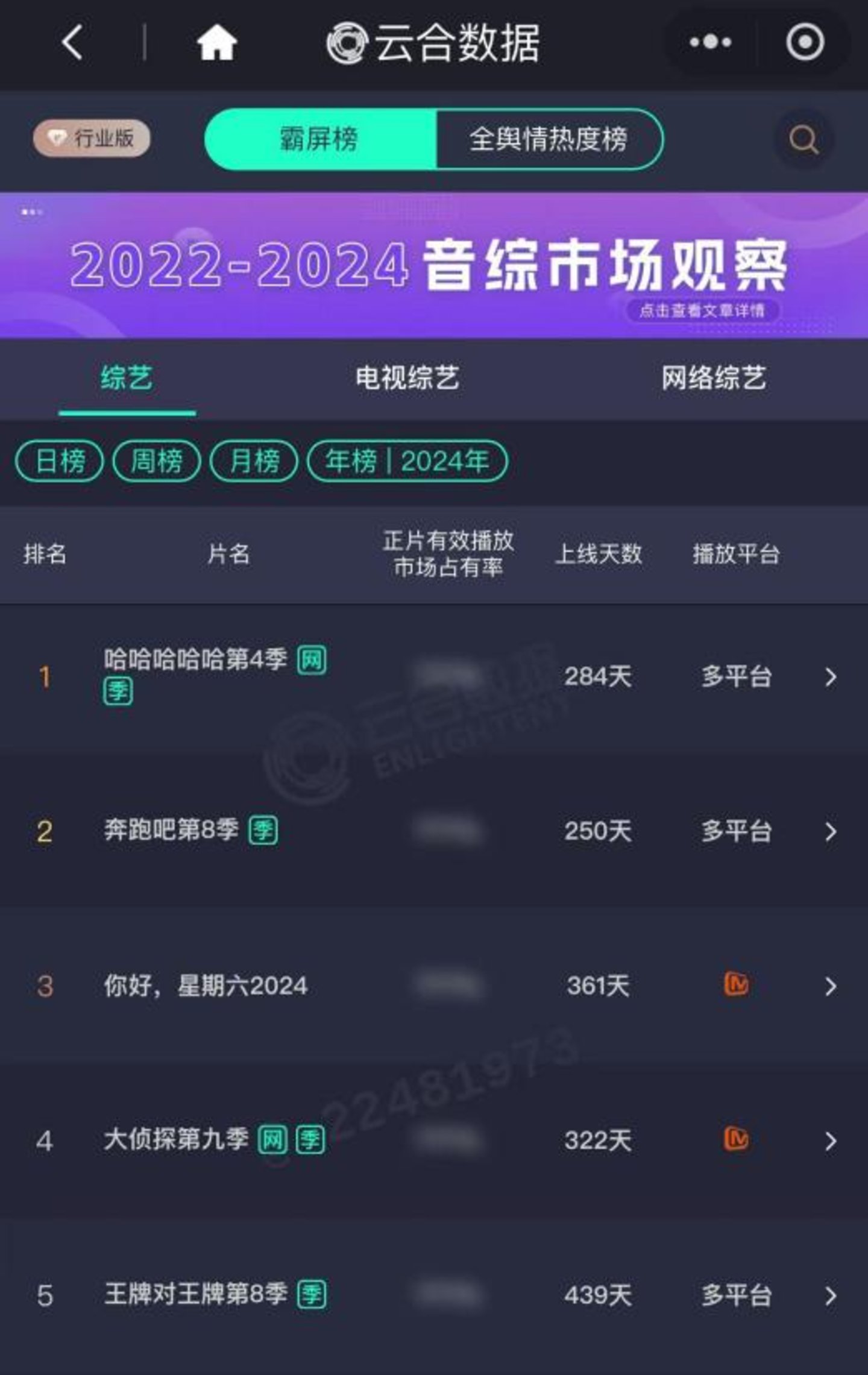 从播出表现来看,虽然市场仍在不断强调创新,但综艺内容表现上却呈现出“姜还是老的辣”。2024在更综艺中,综N代的部数占比为42%,有效播放占比为74%。在云合数据2024年综艺霸屏年榜单中,《哈哈哈哈哈第四季》《奔跑吧第八季》《你好,星期六2024》《大侦探第九季》《王怕对王牌第八季》等综N代霸榜TOP5 ,在此当中,最“年轻”的五哈也已四岁有余。其中,四成为芒果TV独播、两成为爱奇艺独播。
