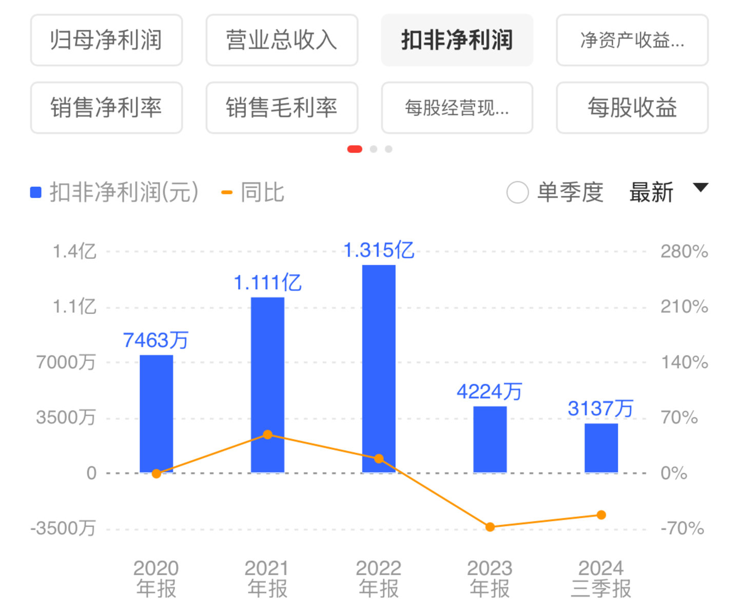 行业内卷的一个必然是价格战,随着低价比拼在农药行业深化,美邦股份的扣非净利润从2022年的1.3亿骤然降至2023年的4224万,降幅约7成,这一态势在2024年几乎没有改观。