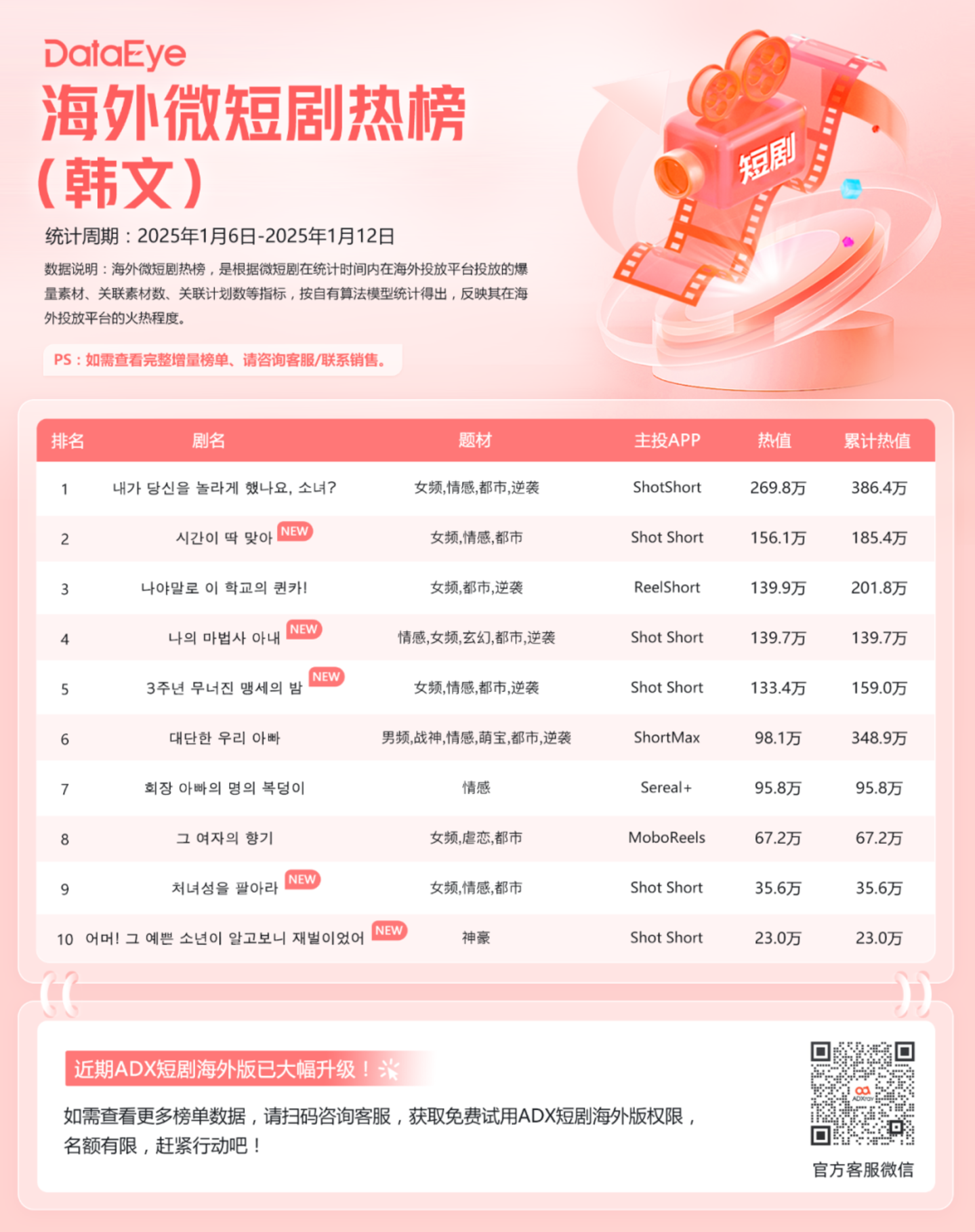 本期(1月6日-1月12日)DataEye海外韩文短剧热榜,《내가 당신을 놀라게 했나요, 소녀?》第一;《시간이 딱 맞아》第二;《나야말로 이 학교의 퀸카!》位列第三。