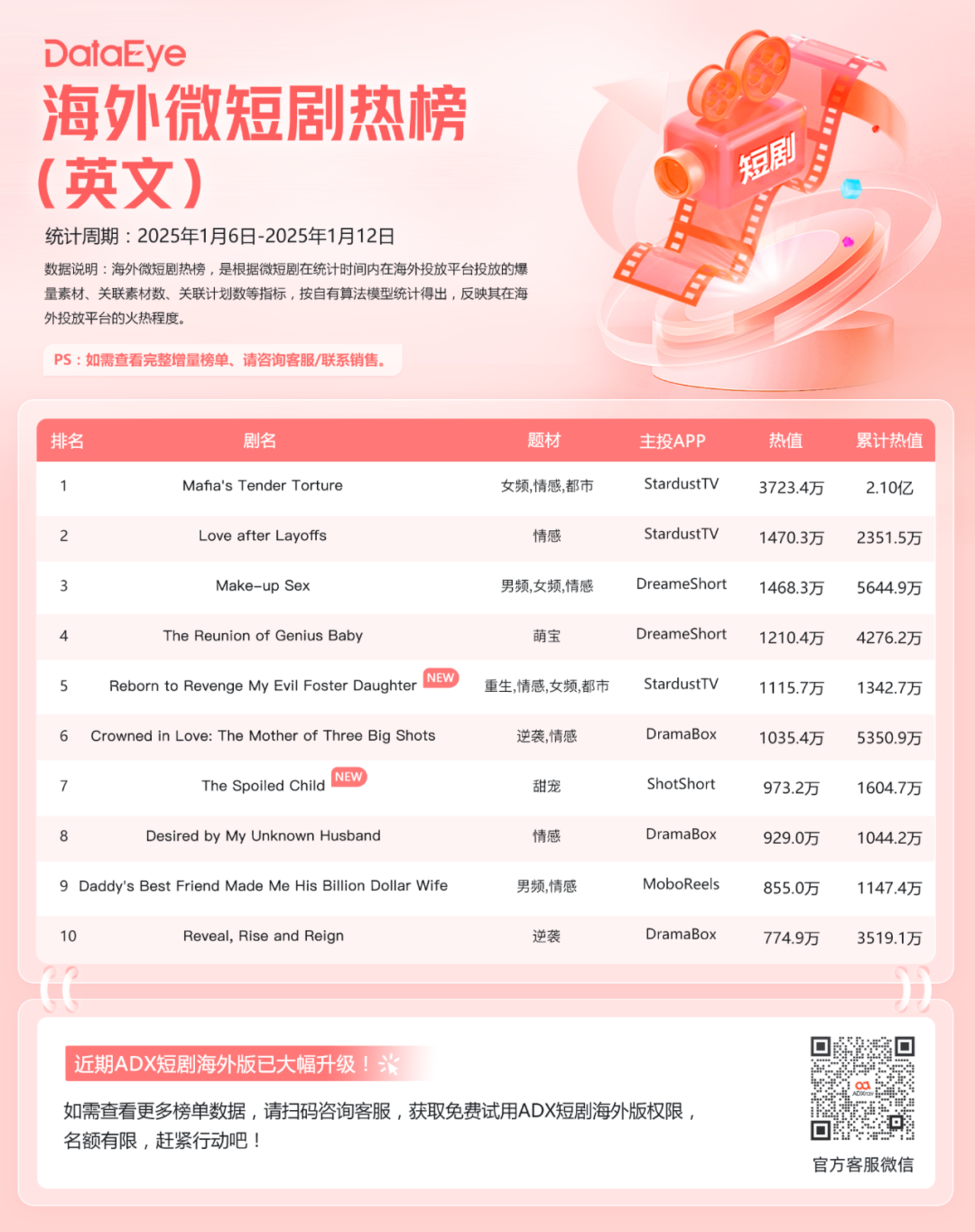 透过一周(1月6日-1月12日)海外数据,DataEye短剧观察发现了以下几个主要趋势和结论: