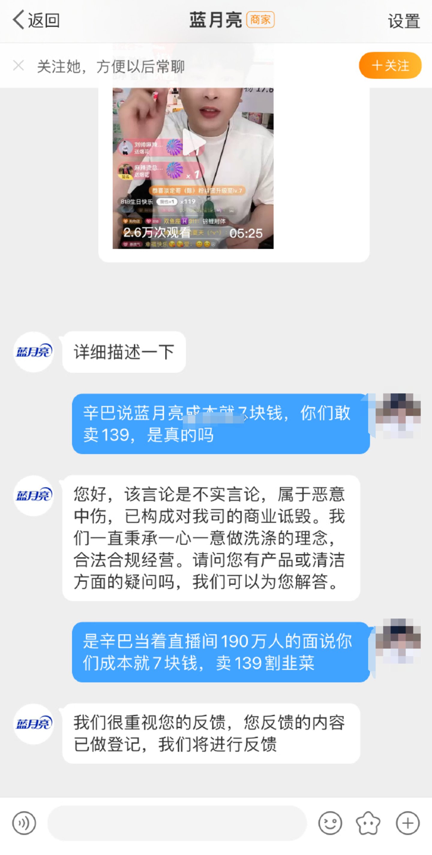 不少网友义愤填膺地私信蓝月亮官方,“辛巴说蓝月亮成本就7块钱,你们却敢卖139元,这是真的吗?”