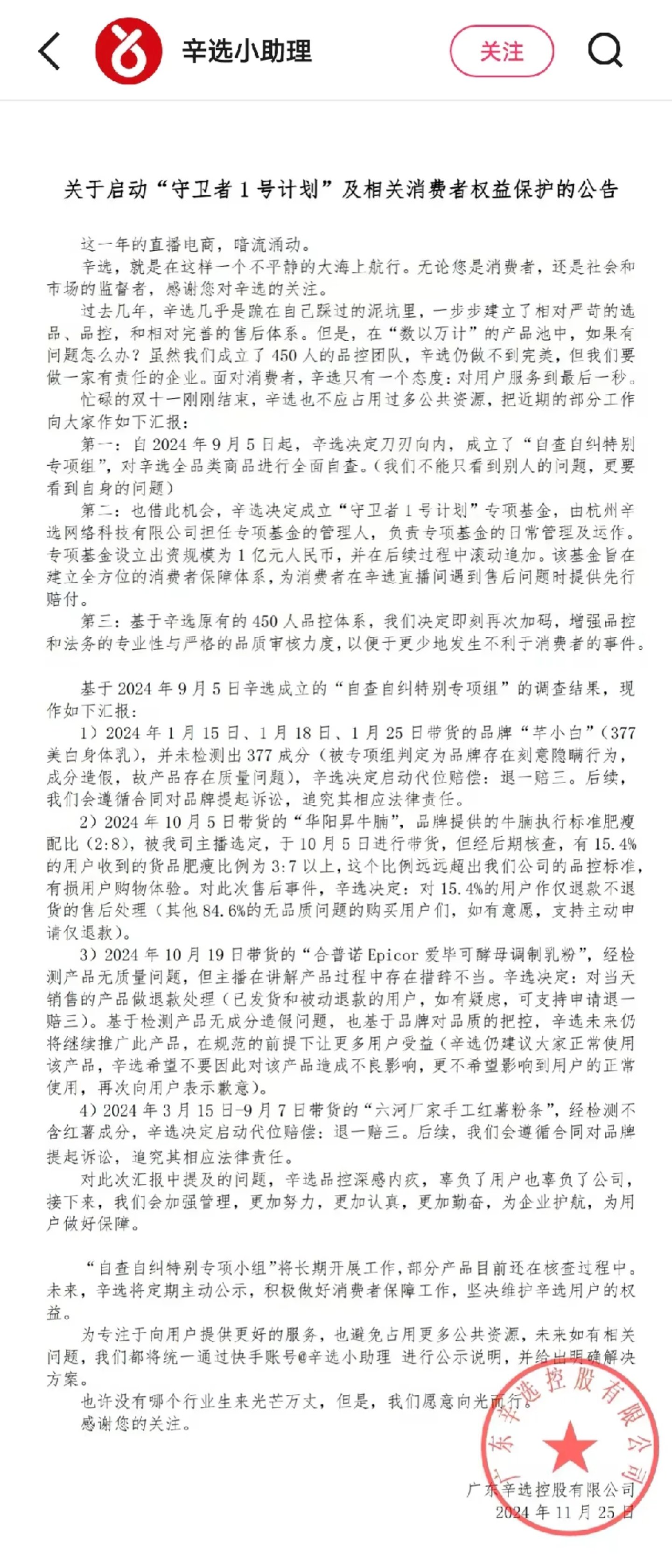 值得一提的是,在11月25日,白云区市场监管局决定对辛巴虚假宣传事件开始依法调查时,辛选集团也发布了《关于启动“守卫者1号计划”及相关消费者权益保护的公告》。这般立正挨打、自省自查的姿态有效缓和了事态的进一步发酵。