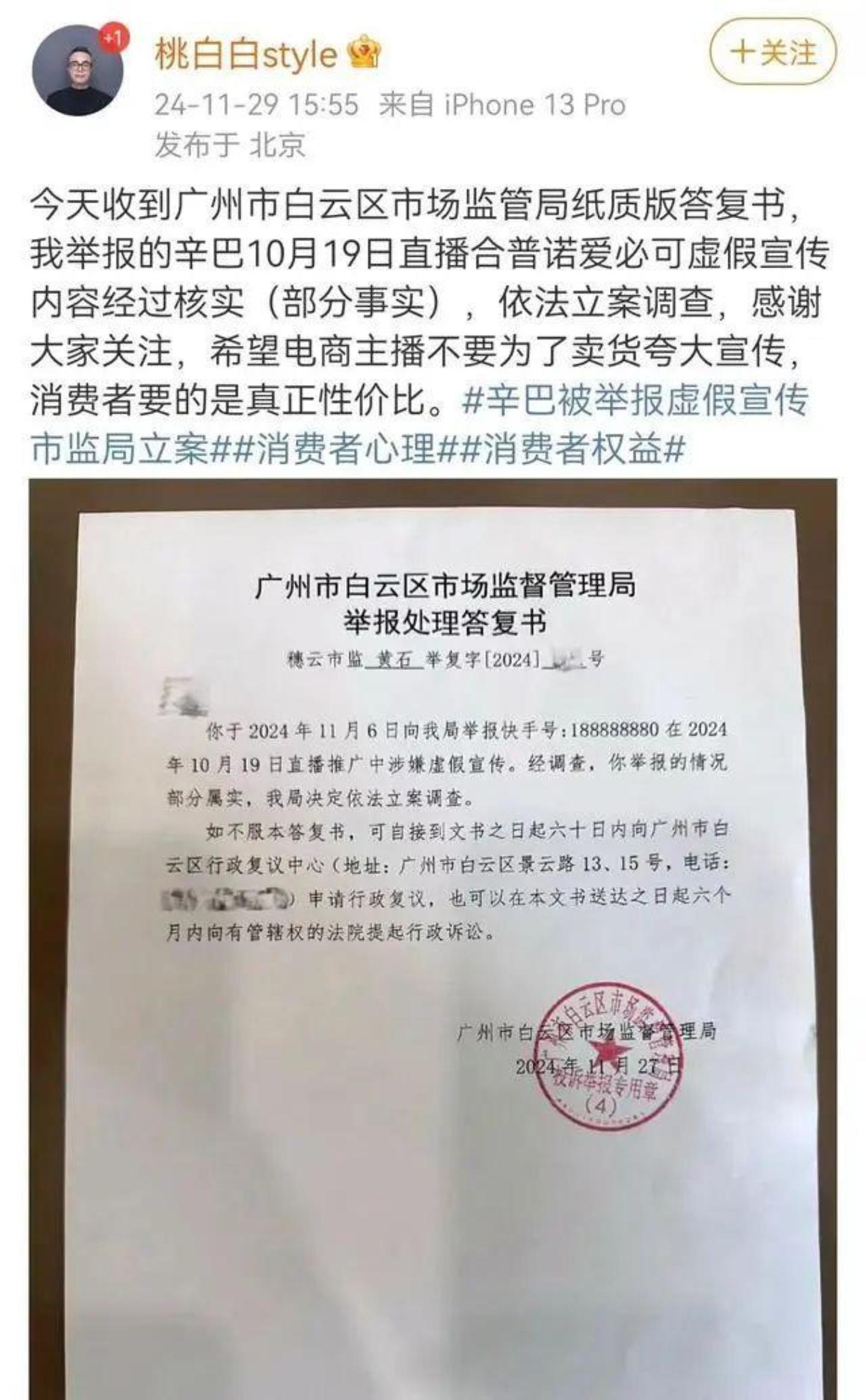 博主“桃白白style”则实名举报辛巴和徒弟蛋蛋直播间虚假宣传,称辛巴10月19日直播合普诺爱必可虚假宣传部分属实,依法立案调查。