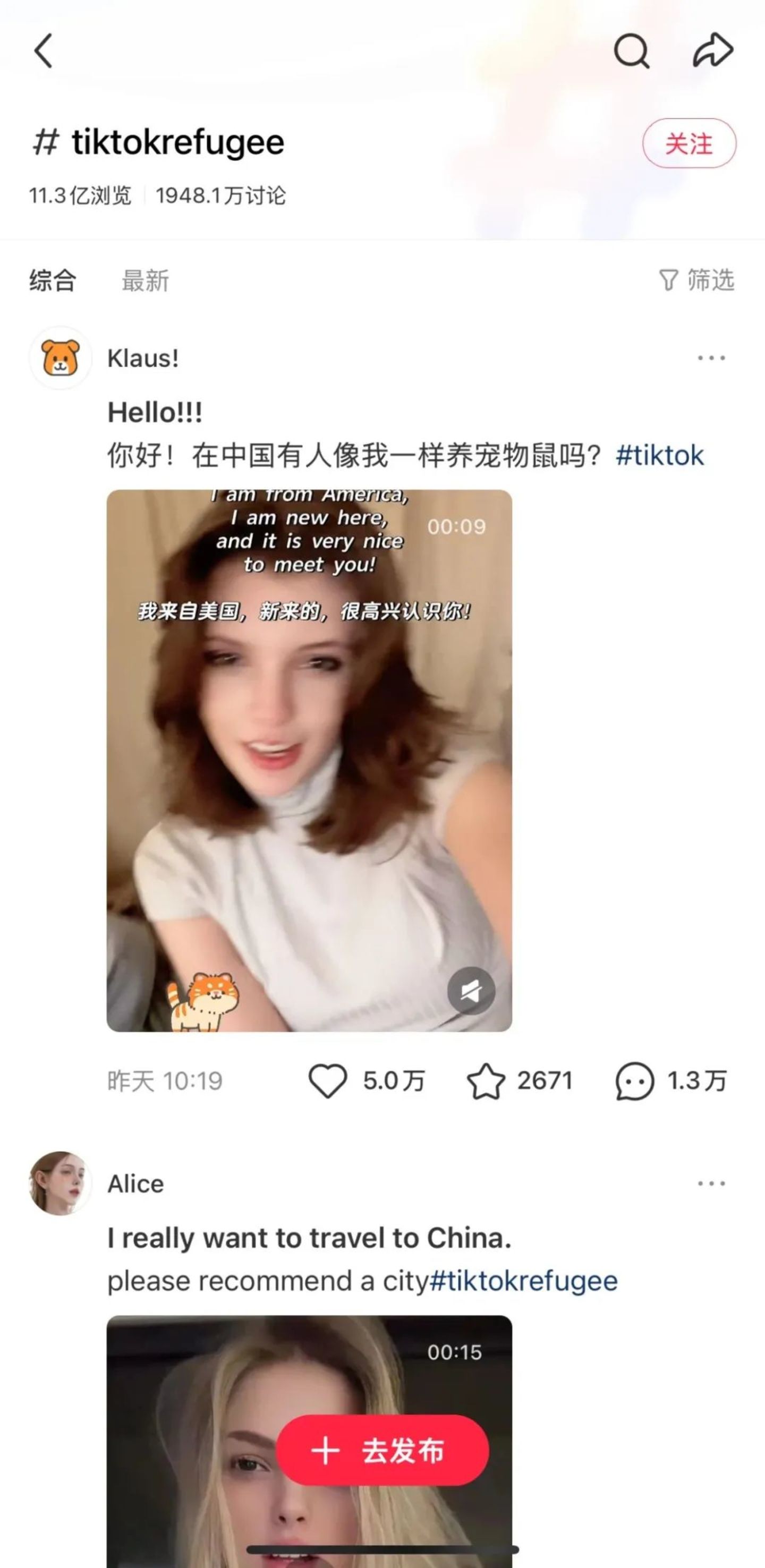 本周以来,大批从TikTok迁移而来的创作者和用户涌入小红书,他们说着蹩脚的中文,在小红书上与中国网友「贴贴」。