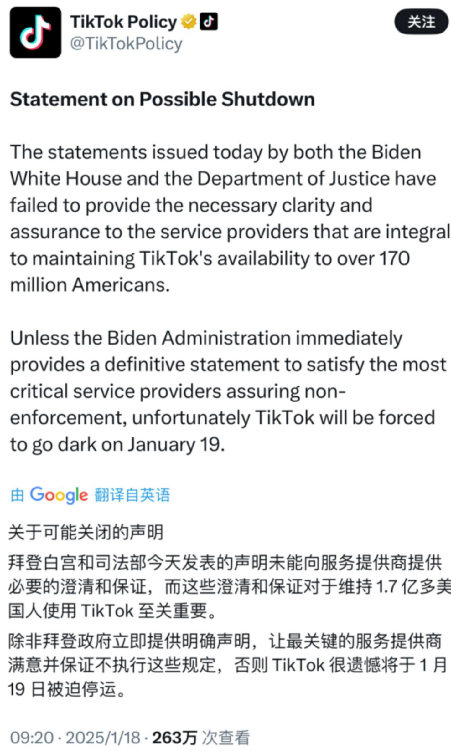 在美联邦最高法院裁定发出次日,1月18日,TikTok在X上发出声明,敦促美国政府向TikTok的相关服务商提供必要的澄清和保证,否则TikTok将于1月19日被迫停运。孟庆们也被通知“工作稳定”,离职大礼包暂时领不上了。