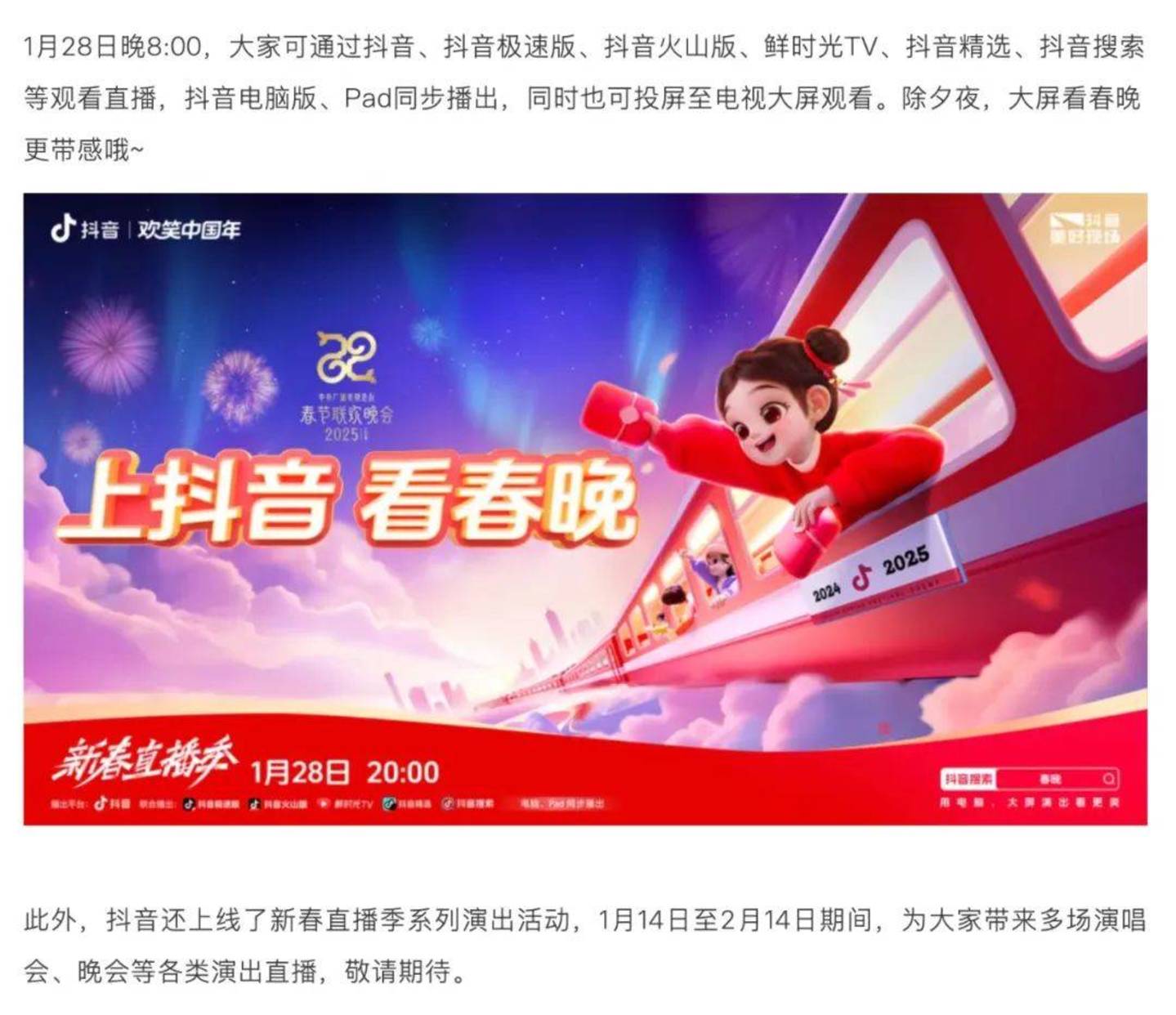 「上抖音 看春晚」,今年抖音于15日官宣了与蛇年春晚的直播合作,并同时公布了「新春直播季」陪伴式IP将于1月14日至2月14日带来多场演唱会、晚会或直播,这给习惯用短视频看春晚的用户吃了一颗定心丸。