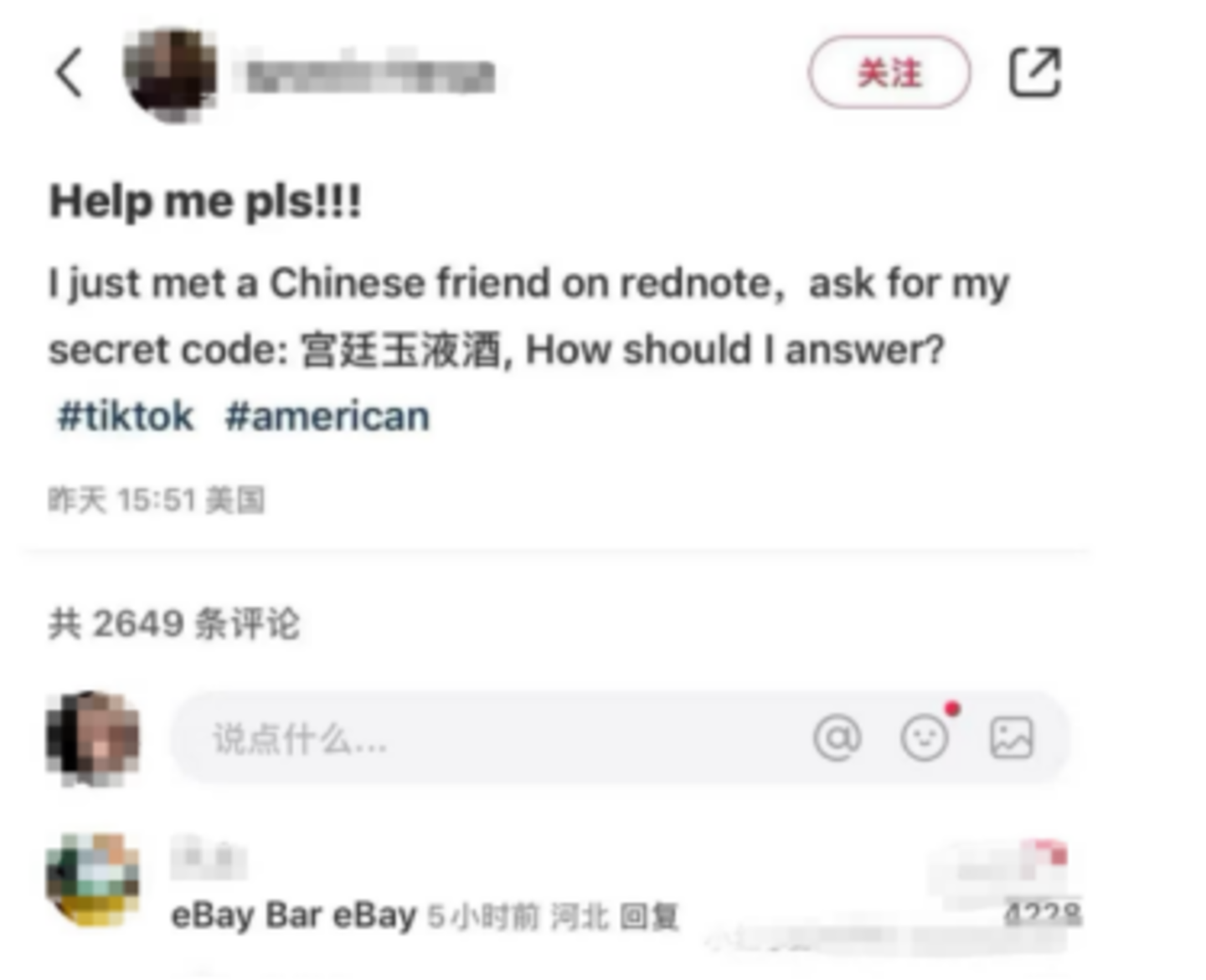那是“TikTok难民涌入小红书”连续剧的第一集:初来乍到。美国用户像是刚来报到的新生,青涩懵懂,在新环境里,文化碰撞持续发生——他们时常被评论区的“大胆发言”吓到,不确定这是玩梗还是性骚扰与威胁。也会被抽象的文案和梗图弄得晕头转向,不断发问“为什么”“什么意思”。